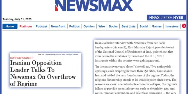 في مقابلة حصرية مع صحيفة نيوزماكس، من مقرها في باريس عبر البريد الإلكتروني، أكدت السيدة مريم رجوي، الرئيسة المنتخبة للمجلس الوطني للمقاومة الإيرانية، أن “انتفاضة الشعب الإيراني ليست طموحًا بعيدًا، بل هي جارية بالفعل”. جاء ذلك في أعقاب الغارات الجوية الأمريكية على المنشآت النووية الإيرانية في 21 يونيو، والدعوات التي أطلقها الرئيس الأمريكي دونالد ترامب ورئيس الوزراء الإسرائيلي بنيامين نتنياهو لتغيير النظام.