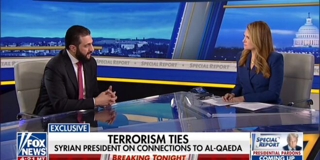 (10 نوفمبر 2025)أجرى الرئيس السوري الانتقالي أحمد الشرع مقابلة حصرية مع قناة فوكس نيوز الأمريكية بعد لقائه مع الرئيس دونالد ترامب في البيت الأبيض. ركزت المقابلة على التحولات في سوريا بعد سقوط نظام الأسد، وجهود بناء علاقات جديدة مع الولايات المتحدة، رفع العقوبات، والتعاون الأمني. النقاط البارزة:العهد الجديد في سوريا والعلاقات مع واشنطن: أكد الشرع أن “سوريا دخلت عهدًا جديدًا بعد النظام السابق، وهذا سيبني استراتيجية جديدة مع واشنطن”. وصف زيارته إلى البيت الأبيض بأنها “بداية استراتيجية جديدة للعلاقات مع الولايات المتحدة بعد 60 عامًا من العزلة”، مشددًا على أهمية الانتقال من التهديد الأمني إلى “حليف استراتيجي”.رفع العقوبات والاستثمار: ناقش مع ترامب “المستقبل ورفع العقوبات”، وأبرز فرص الاستثمار في سوريا لتعزيز الاستقرار الاقتصادي، قائلًا إن ذلك سيحول النظرة إلى سوريا من “تهديد أمني” إلى شريك موثوق.التعاون ضد الإرهاب: ذكر مشاركة قواته في “العديد من المعارك ضد تنظيم الدولة (داعش) على مدى 10 سنوات”، وطالب بأن “وجود القوات الأمريكية في سوريا يجب أن يتم بالتنسيق مع الحكومة السورية”، مع الحاجة إلى “اتفاق بشأن تنظيم الدولة”.العلاقات مع إسرائيل: أعرب عن عدم الرغبة في محادثات مباشرة الآن، قائلًا: “إسرائيل تحتل الجولان، ولن ندخل في محادثات مباشرة معها الآن. الوضع في سوريا مختلف عن الدول التي وقعت اتفاقات أبراهام”. ومع ذلك، أشار إلى أن “الإدارة الأمريكية قد تساعدنا في الوصول إلى نوع من المفاوضات مع إسرائيل”.الماضي مع القاعدة: نفى أن يكون ارتباطه السابق بالقاعدة موضوعًا للنقاش مع ترامب، وقال: “الارتباط بالقاعدة أصبح من الماضي ولم أناقشه مع ترامب”.قضية المفقودين الأمريكيين:أكد التزامه بـ”بذل قصارى جهدي للحصول على معلومات عن أوستن تايس وبقية المفقودين”، مشيرًا إلى لقائه مع والدة تايس (الجندي الأمريكي المفقود).