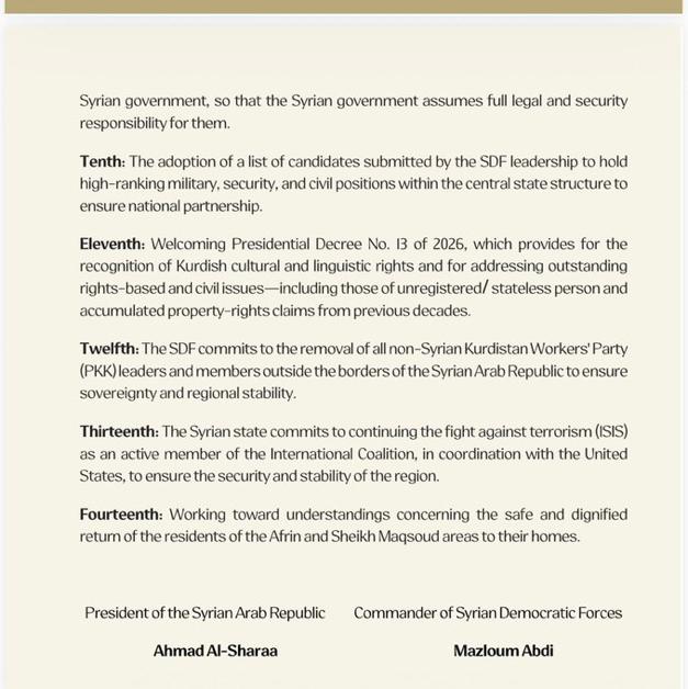 عاشرًا: اعتماد قائمة من المرشحين تقدمها قيادة قوات سوريا الديمقراطية لتولي مناصب عسكرية وأمنية ومدنية رفيعة ضمن بنية الدولة المركزية، بما يضمن الشراكة الوطنية.